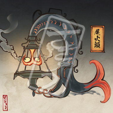その昔、頭が二股に燃える、尾火頭と呼ばれる化け物がいた。とある勇気ある人間が、その化け物の頭に覆いを被せた。以来、尾火頭が街に現れると、暗い街路が尾火頭の頭の炎の明かりで照らされ、それが街灯になったとさ。めでたしめでたし。