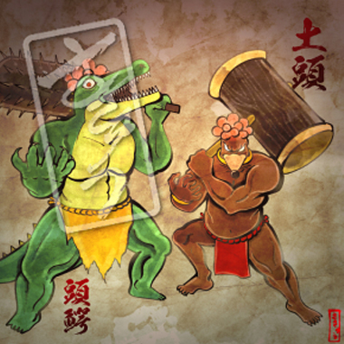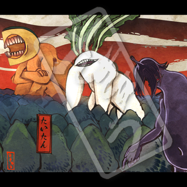 西日本特に関西に現れたとされる巨人。図のたいたんはそれぞれ、かぼちゃ、大根、なすのたいたんと呼ばれていた。町を襲った悪いたいたんが、煮えたぎった巨大鍋に落とされ退治されたという伝説があり、このことから大体の煮物を「〜のたいたん」と呼ぶ地域ができたとされる。知らんけど