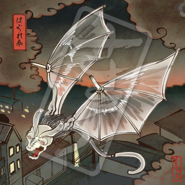 ポツンと置き去りにされたビニール傘が、その孤独感から化けたもの。曇天や雨の降る夜に空を徘徊し、尾の先で人間を引っ掛けてそのままどこかへ連れ去るといわれる。いわゆる神隠しの一つ。