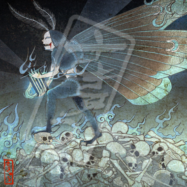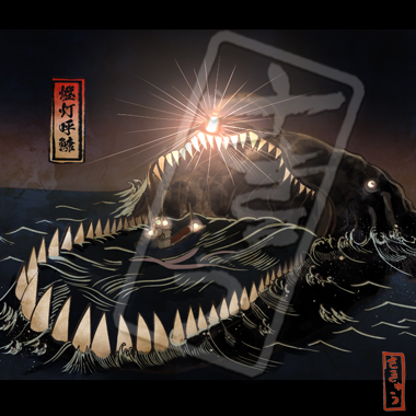誘蛾灯で焼け死んだ蛾の怨念が集まり生まれた化生。絶えず羽を燃やし続ける炎は執念の象徴。抱えている灯の怪しい青い光は、人間も呼び寄せる。呼び寄せられた者は皆、頭から食われる。灯りを以って骸を重ねる蛾という事から、骸灯蛾と呼ばれ恐れられている。