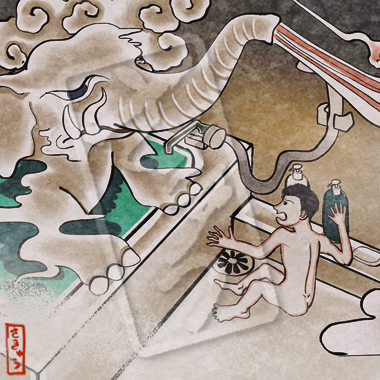 浴室に現れる霧のような象。浴室に入ると尿意を感じるのは、霧象が鼻から吹き出す象気、もとい蒸気によるもの。追い出そうと浴室の扉を開けても居座り続けるなかなかしぶといやつ。