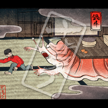 炬燵に取り込まれ生活も肉体も溶けてしまった人間の成れの果て。鍋牛に取り込まれると、とても温かく気持ちが良くなり、冬が明けるまで鍋牛の一部になってしまう。かたつむりを指す蝸牛と、冬の風物詩である鍋を掛けた言葉遊びが由来。